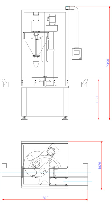 氣動(dòng)托罐裝置,保證充填時(shí)物料不灑出容器外。